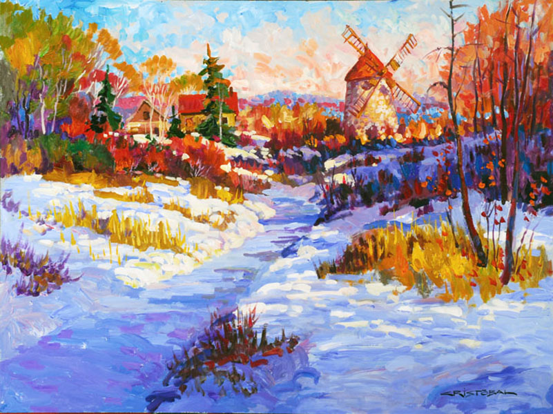 Les tableaux de campagnes peints à l’huile et acrylique sont inspirés de l’art impressionniste, soit une facture souple avec une touche de pinceau gestuelle.