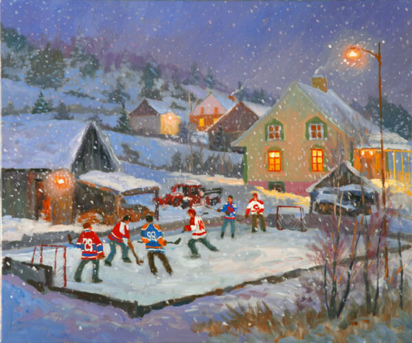 Voici un sujet à caractère culturel, une incursion de l’artiste dans les souvenirs de jeunesse des nord-américains au climat nordique. Le choix de la mise en place a lieu dans la campagne, une scène qui ramène l’observateur sur les traces de nos traditions. Le moment du jour à l’aube ou en soirée est aussi une excuse pour exploiter une palette à la fois complexe et enrichissante car deux sources de lumière interviennent; naturelle et artificielle, voilà un autre des défis dans la carrière de l’artiste.